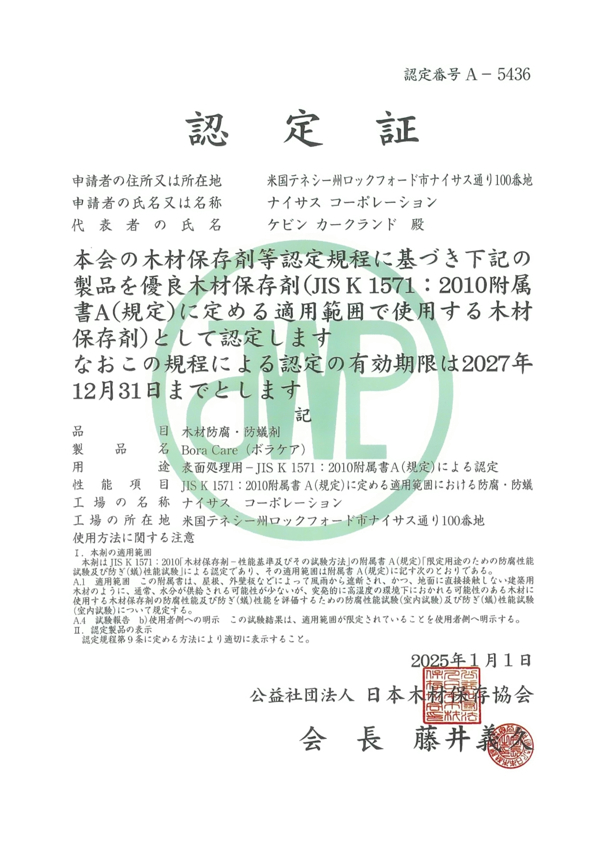 平成25年2月、ナイサス社 ボラ ケア(防腐・防蟻薬剤)が(社)日本木材保存協会の認定薬剤になりました。これによりフラット35、住宅性能表示制度・劣化対策等級3に定める現場処理用の防腐・防蟻薬剤(土台以外の木部の防腐・防蟻処置剤)として使用することが出来るようになりました。ナイサス社 ボラ